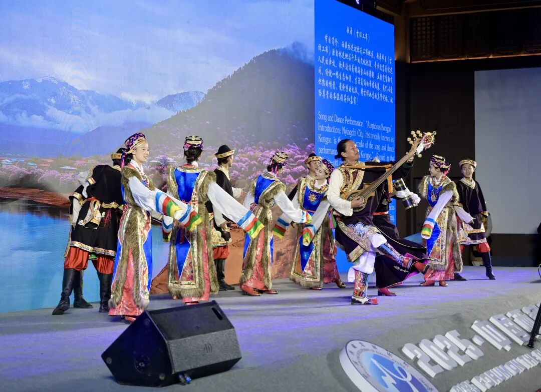 开幕式在《吉祥工布》的旋律中拉开了序幕。舞者们身着色彩斑斓的工布服饰,仿佛从雪山深处走来的精灵,正以热情的舞步迎接八方宾客,每一个转身、跳跃都充满了对远道而来客人的真挚欢迎。