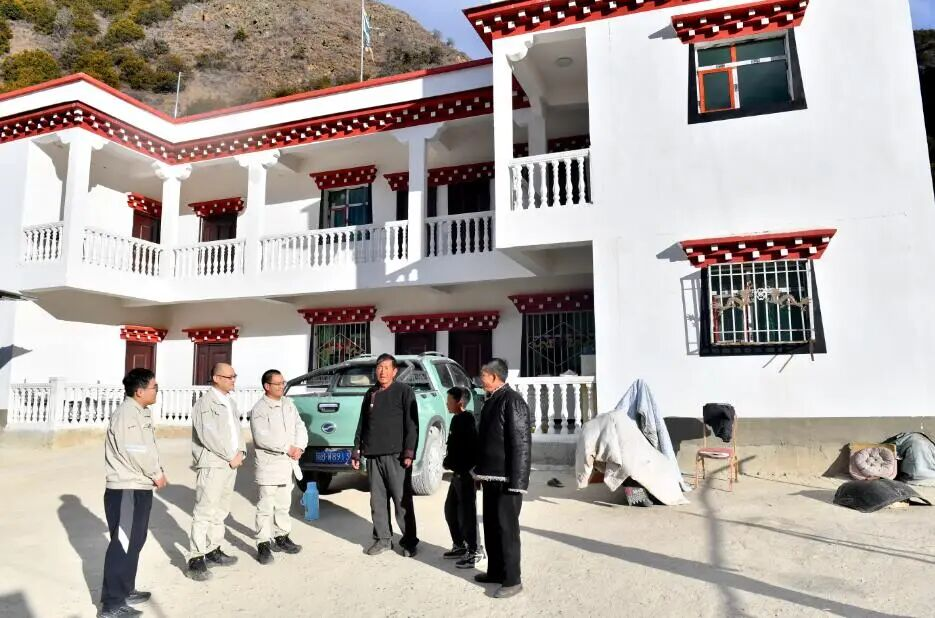 西藏大唐扎拉公司移民管理部中级主管向巴扎西(右二)走访群众。记者 温凯 平措朗加 摄